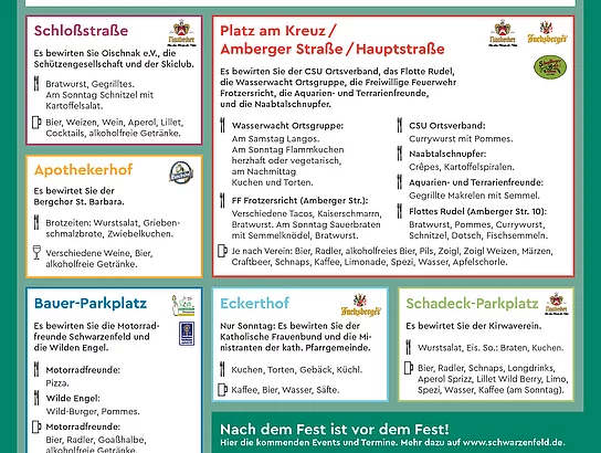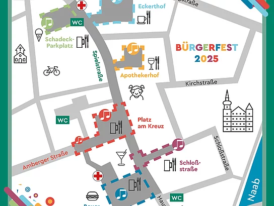 Es ist wieder so weit! In Schwarzenfeld ist in 2025 Bürgerfest. Freuen Sie sich auf ein tolles Programm mit viel Live-Musik, Unterhaltung und Spaß – auch und gerade für unsere kleinen Bürgerinnen und Bürger. Die ortsansässigen Vereine legen sich ordentlich ins Zeug, um Sie mit kulinarischen Köstlichkeiten und einem wunderbaren Ambiente zu überraschen. Es gibt wieder die beliebte Weinlaube im Apothekerhof, ein Rock-Fest mit bekannten Bands am Bauer-Parkplatz und auch feinste Musik gepaart mit kühlen Getränken in lauer Abendstimmung am Platz am Kreuz, am Schadeck-Parkplatz und in der Schloßstraße. Stöbern Sie durch den Lageplan und das Programm, Ihre Vorfreude wird ganz von alleine steigen! Bis bald zum Bürgerfest in Schwarzenfeld!