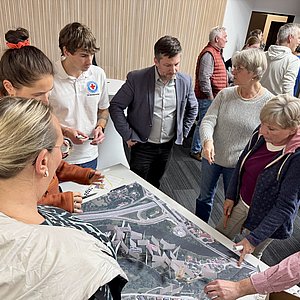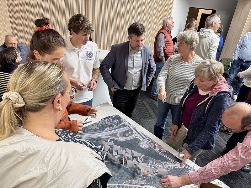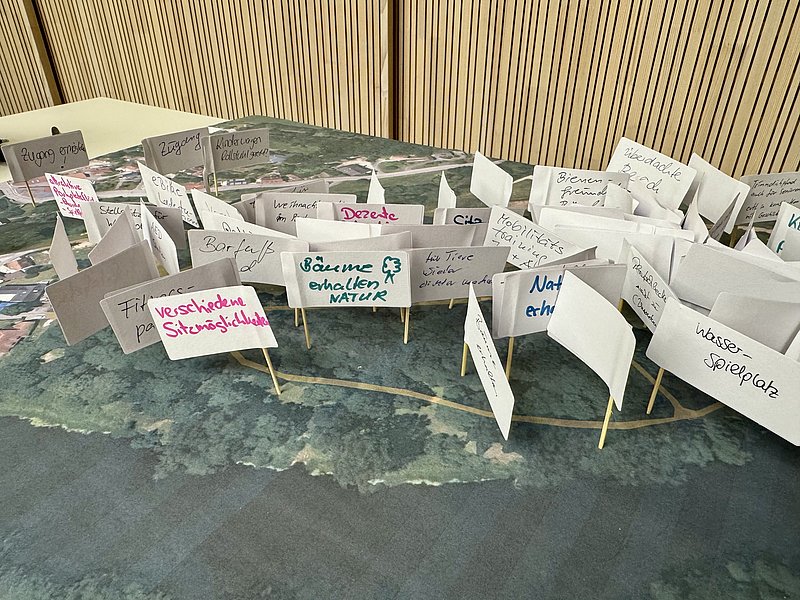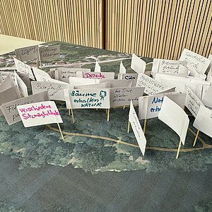 Die inhaltliche Arbeit leitete Stadtplanerin Barbara Wilnhammer vom Büro Wild & Wilnhammer Architekten und Stadtplaner. An drei Stationen sammelten die Teilnehmenden Ideen, markierten Bereiche auf Plänen und setzten Klebepunkte zur Gewichtung der Vorschläge.