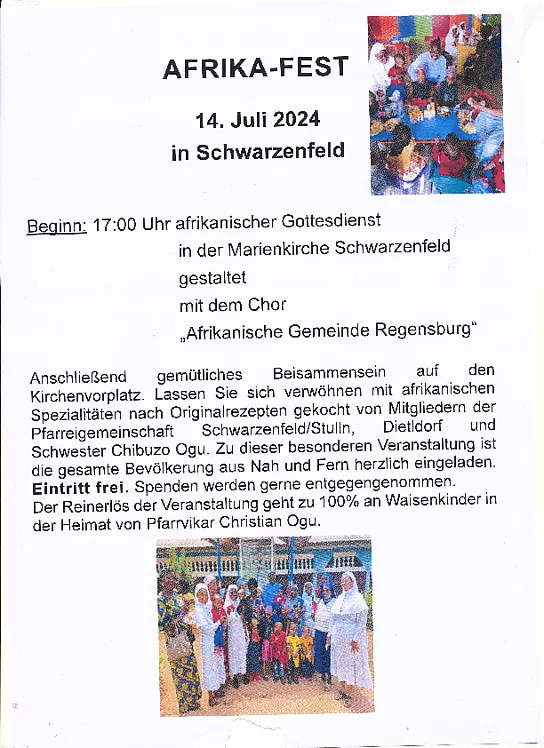Afrikanischer Gottesdienst mit dem Chor "Afrikanische Gemeinde Regensburg" und anschließend gemütliches Beisammensein auf den Kirchenvorplatz mit afrikanischen Spezialitäten (bei Schlechtwetter im Pfarrheim).