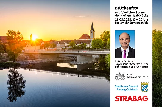 Der Markt Schwarzenfeld, das Staatliche Bauamt Amberg-Sulzbach und die Baufirma STRABAG veranstalten am 23.05.2025 von 17 bis 20 Uhr ein Brückenfest bei der Feuerwehr Schwarzenfeld. Der Bayerische Staatsminister der Finanzen und für Heimat Albert Füracker hat seine Teilnahme zugesagt. Höhepunkt ist die feierliche Segnung der neuen Kleinen Naabbrücke durch Pfarrvikar Christian Ogu und Diakon Jürgen Weich. Die Musikkapelle Schwarzenfeld begleitet den Abend. Das Staatliche Bauamt Amberg-Sulzbach wird Informationen rund um den Brückenbau präsentieren, die Feuerwehr Schwarzenfeld und die STRABAG zeigen eine Fahrzeugschau. Für das leibliche Wohl ist gesorgt. Für die kleinen Gäste gibt es eine Hüpfburg. Die Einnahmen aus dem Getränke- und Bratwurstverkauf kommen der Feuerwehr Schwarzenfeld zugute.
