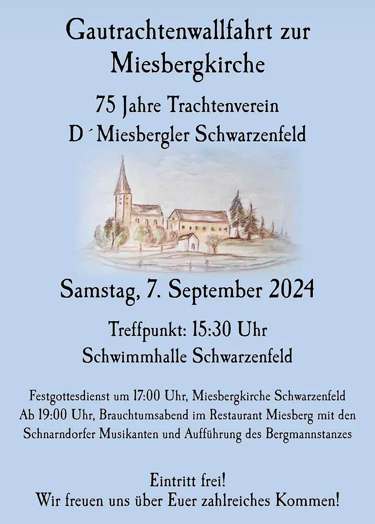 Der Trachtenverein D’Miesbergler lädt ein zur Gautrachtenwallfahrt vom Ortskern zum Miesberg mit anschließendem Volkstanzabend. Für mehr Infos auf die Überschrift klicken!