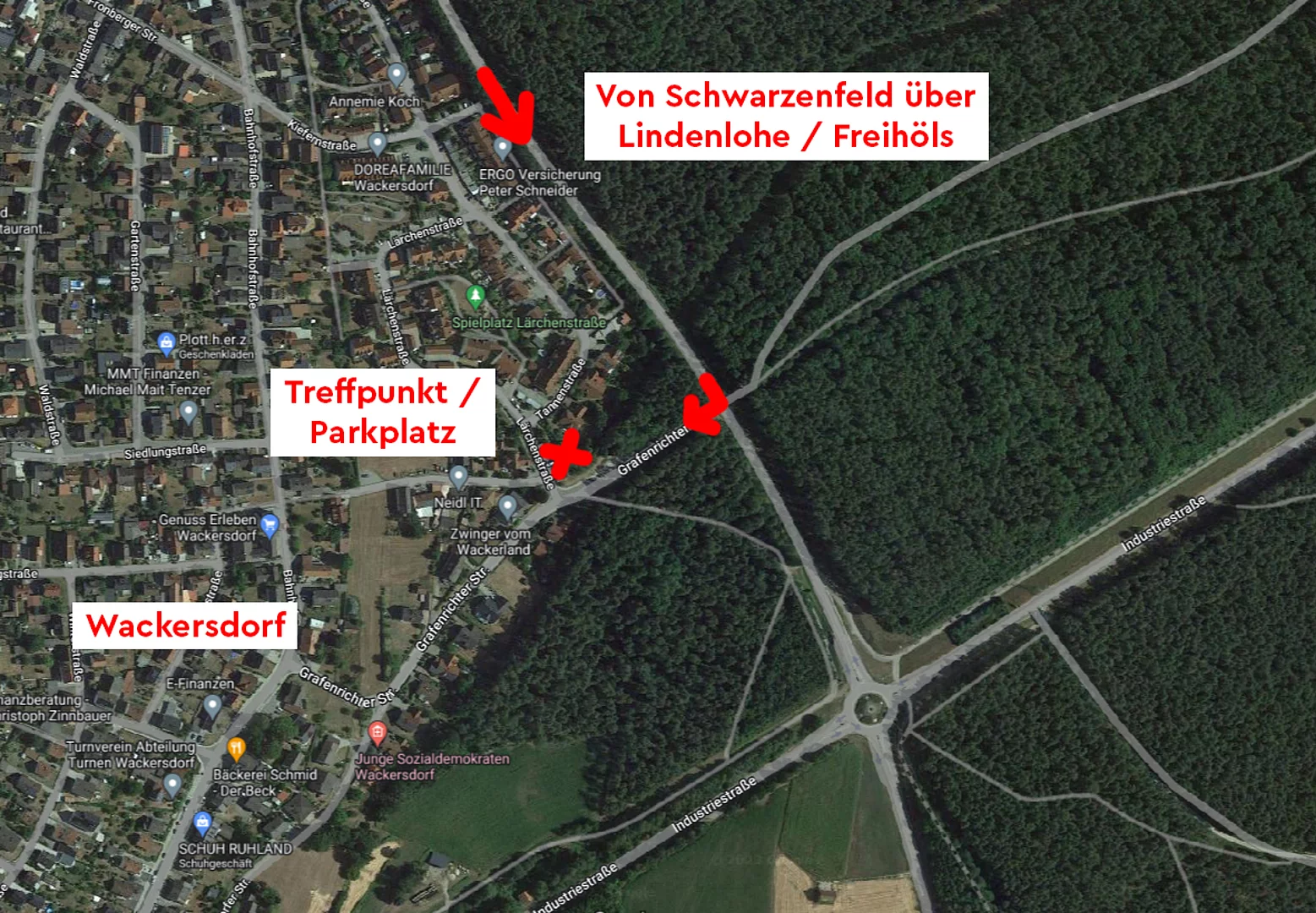 Treffpunkt: Wald beim Ortsteil Asbach, siehe Anfahrtsskizze! Für das Navi: Asbach 4, 92521 Schwarzenfeld und dann die kleine Straße bis zum Waldrand weiterfahren. Google Maps Link: https://maps.app.goo.gl/6YMfpJSmn6c6hoBQ6