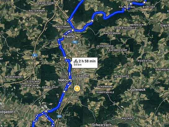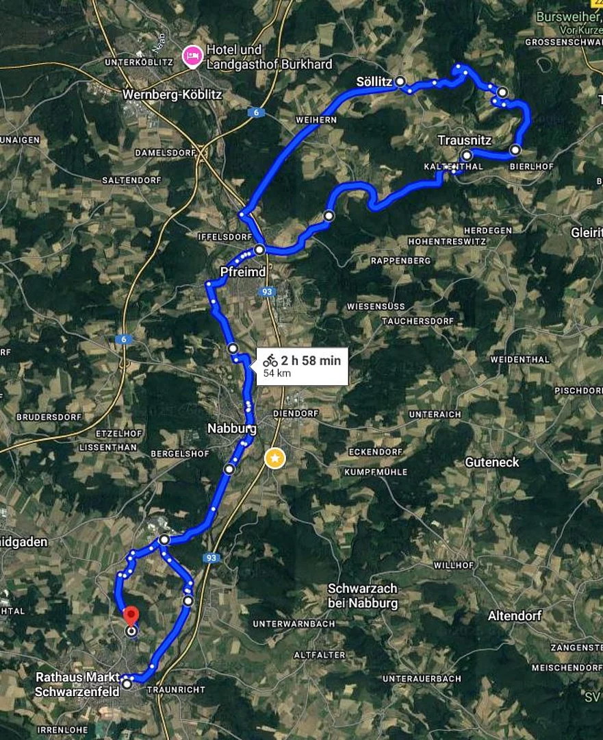 Route: Schwarzenfeld, Brensdorf, Stulln, Nabburg, Haindorf, Pfreimd, Kaltental, Trausnitztalsperre, Reisach, Söllitz, Weihern, Pfreimd, Nabburg, Stulln, Schwarzenfeld.