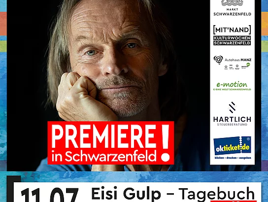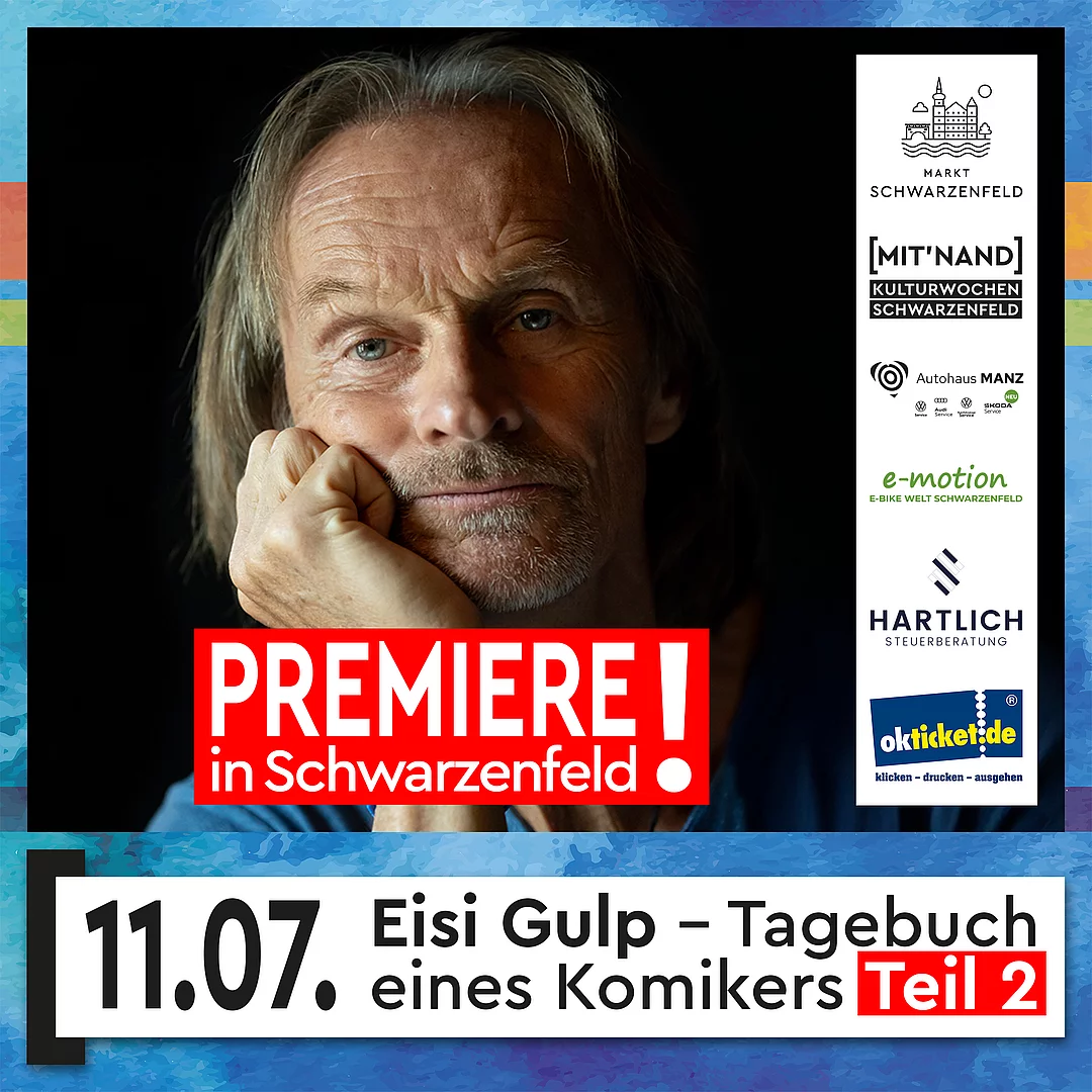 Spätestens seit den Eberhofer-Krimi-Verfilmungen ist Eisi Gulp einem breiten Publikum bekannt als der kiffende Film-Papa des Polizisten Franz Eberhofer. Seit 2015 spielt er in der Serie "Dahoam is Dahoam" und hat darüber hinaus in unzähligen Spielfilmen und Serien mitgewirkt. Nachdem er sich 2024 und 2025 mit seinem Programm "Tagebuch eines Komikers, Teil 1" als Kabarettist zurückgemeldet hatte, folgt jetzt das neue Solo-Programm "Tagebuch eines Komikers, Teil 2"! DIe Premiere findet in Schwarzenfeld statt! Ein Abend, der sicher die Lachmuskeln bis zum äußersten Strapazieren wird, ist garantiert. Und natürlich darf sich das Publikum auch auf seine legendären Tanzeinlagen freuen.