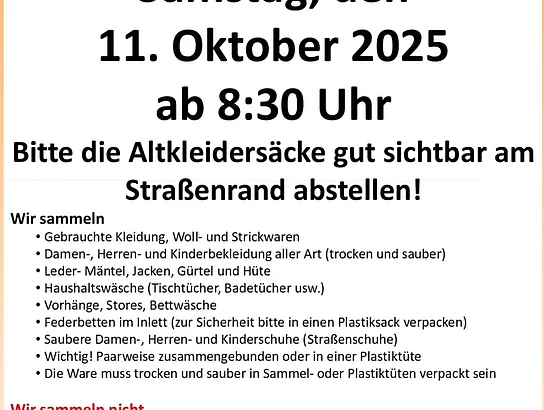 Angenommen werden gebrauchte Kleidung, Wäsche, Woll- und Strickwaren, Kleider, Anzüge, Betten, Bettwäsche und Schuhe (paarweise gebündelt), aber keine Lumpen oder verschmutze und kaputte Textilien. Die Sammelsäcke werden wieder verteilt.DasSammelgut sollte am Sammeltag bis 8.30 Uhr gut sichtbar am Bürgersteig bereit gestellt werden.