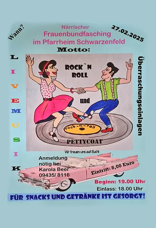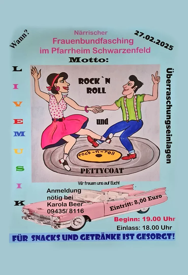 Motto am Unsinnigen Donnerstag 27.02.25 "Rock´n Roll und Pettycoat" im Pfarrheim. Eingeladen ist die gesamte weibliche Bevölkerung.