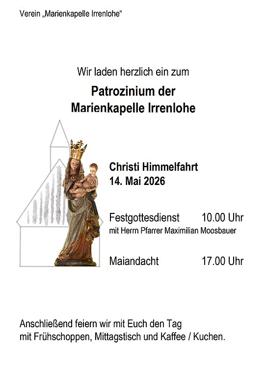 Festgottesdienst, Frühschoppen, Mittagstisch, Kaffee & Kuchen und Maiandacht
