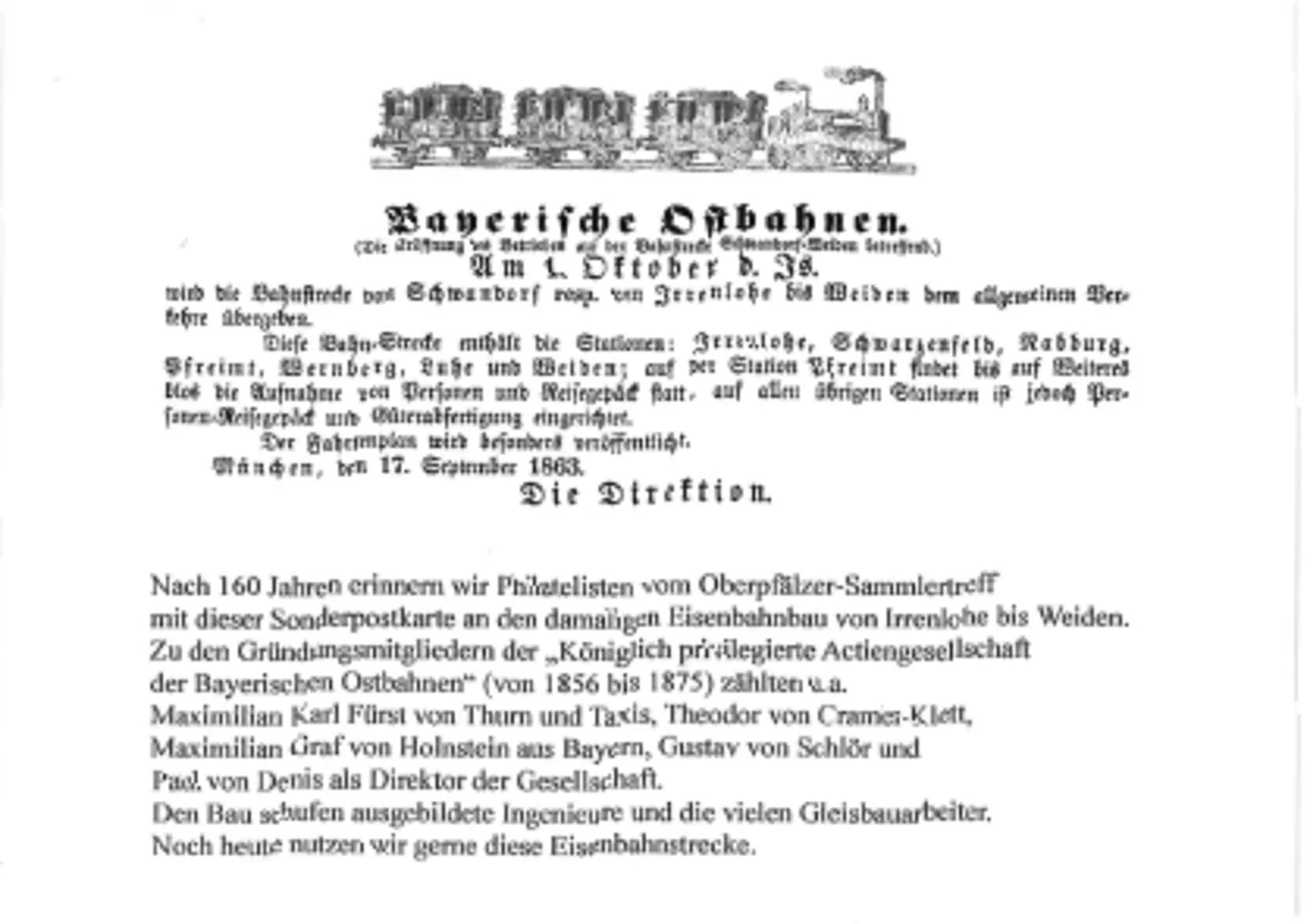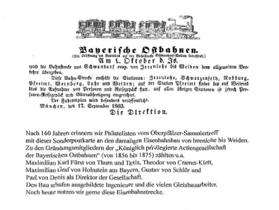 Der Oberpfälzer Sammlertreff, eine offene Interessensgemeinschaft von Philatelisten, Postkarten-Sammlern und Hobby-Historikern für Post- und Heimat-Geschichte aus der Oberpfalz, erinnert gemeinsam mit dem Heimat- und Verschönerungsverein Schwarzenfeld am Wochenende vom 30.09. und 01.10. im Rathaus Schwarzenfeld an die Eröffnung der Bayerischen Ostbahnlinie von Irrenlohe bis Weiden vor 160 Jahren am 01. Oktober 1863. Dazu gibt es Einblicke in die Eisenbahn- und Bahnhofsgeschichte von Schwarzenfeld und Irrenlohe.