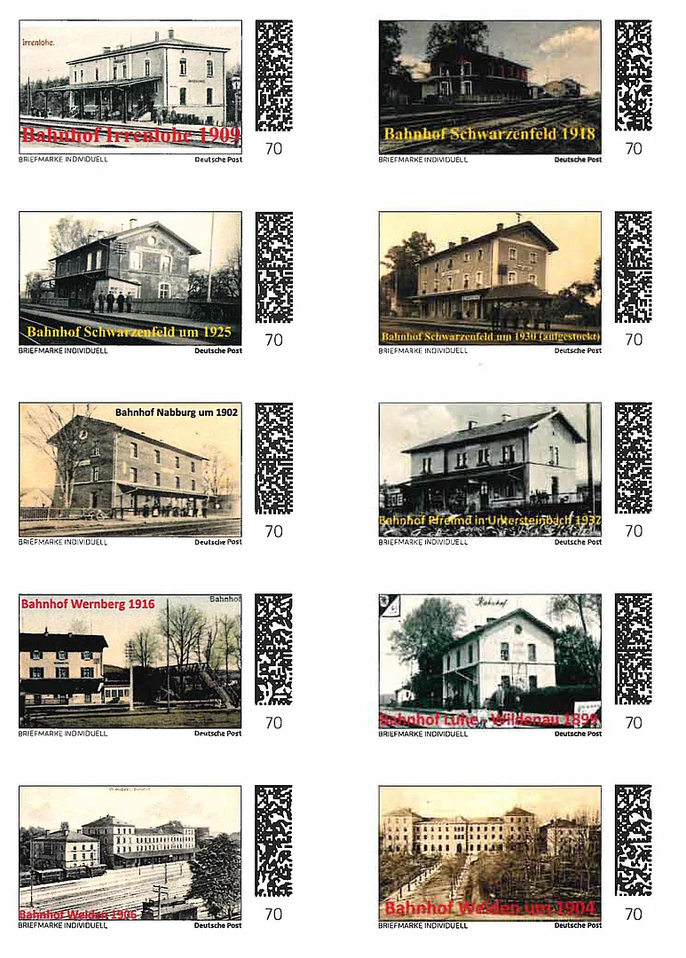 Das Jubiläum verbindet Peter Bartmann, der Initiator seitens des Sammlertreffs, mit der Aktion „Schreib mal wieder eine Postkarte!“ in die Ferne, nur um die Ecke oder an sich selber, wie es Briefmarkensammler machen. Dazu wird das klassische und früher übliche Programm angeboten: Eigens gestaltete Ansichts- und Geschichts-Postkarten und die individuellen Briefmarken können am Samstag, 30.09. von 10 bis 13 Uhr im Rathaus erworben werden. Die fertig beschriebenen und adressierten Postkarten mit historischen Bahnhofsfotografien können dann direkt vor Ort oder auch am Sonntag, 01.10. von 13 bis 17 Uhr in den Sonderbriefkasten im Rathaus-Foyer geworfen werden. Der Verkauf findet nur am Samstag statt. Die Karten werden dann bei der Post-Philatelie in Weiden mit dem eigens für dieses Jubiläum geschaffenen Post-Sonderstempel abgestempelt, der vom Markt Schwarzenfeld beantragt wurde. Der Stempel wird noch im gesamten Monat Oktober bei der Philatelie Weiden verwendet. Allerdings müssen dann die frankierten Belege selbstständig nach Weiden übersandt werden. Die Ansichtskarten und die Briefmarken zeigen Motive von allen Bahnhöfen auf der Jubiläums-Eisenbahnstrecke ab 1863. Die Auflage der Briefmarken ist gering. Der komplette Zehner-Bogen kostet 15 Euro. Zum Briefmarken-Kauf gibt es als Zugabe noch eine Geschichts-Postkarte gratis. Sollten die Bogen nicht ausreichen, können nur bei dieser Veranstaltung am 30.09. im Rathaus weitere bestellt werden. Die Ansichts-Postkarten gibt es jeweils im Set: 7 Stück verschiedene für 5 Euro im Hochglanz für Postkarten-Sammler und 10 Stück verschiedene für 10 Euro.