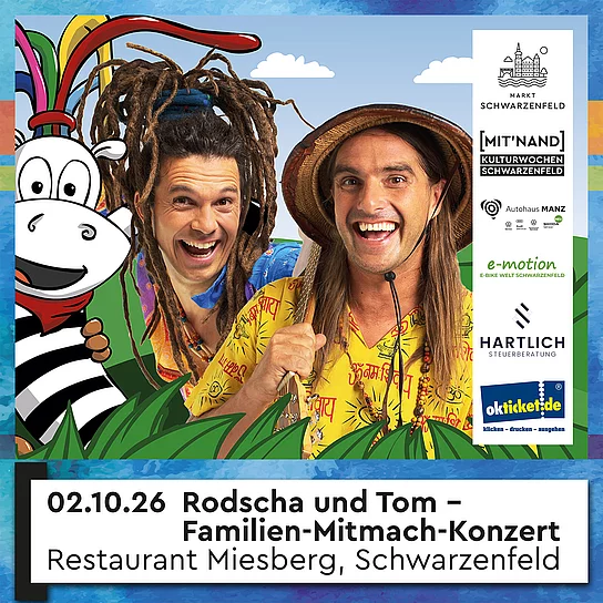 Rodscha und Tom sind Gewinner des Deutschen Kinderliederpreises. Sie begeistern nicht nur Kinder, sondern auch Eltern. Sei dabei, wenn sie live auf der Bühne in Schwarzenfeld auftreten! Begleitet von liebenswerten und vor allem lebensgroßen Figuren wie dem Rastazebra, dem kleinen Affen und dem Koala, erlebst du ein kunterbuntes Abenteuer im Konzert-Dschungel. Singe und feiere gemeinsam mit Rodscha und Tom und lass dich von ihren Werten wie Freundschaft, Mut, Glück und Dankbarkeit berühren. Erlebe das erste Konzert deines Kindes bei "Rodscha und Tom" und feiert zusammen dieses unvergessliche Live-Musik-Erlebnis! Ideal für Kinder ab 1.5 Jahren bis 8 Jahren.