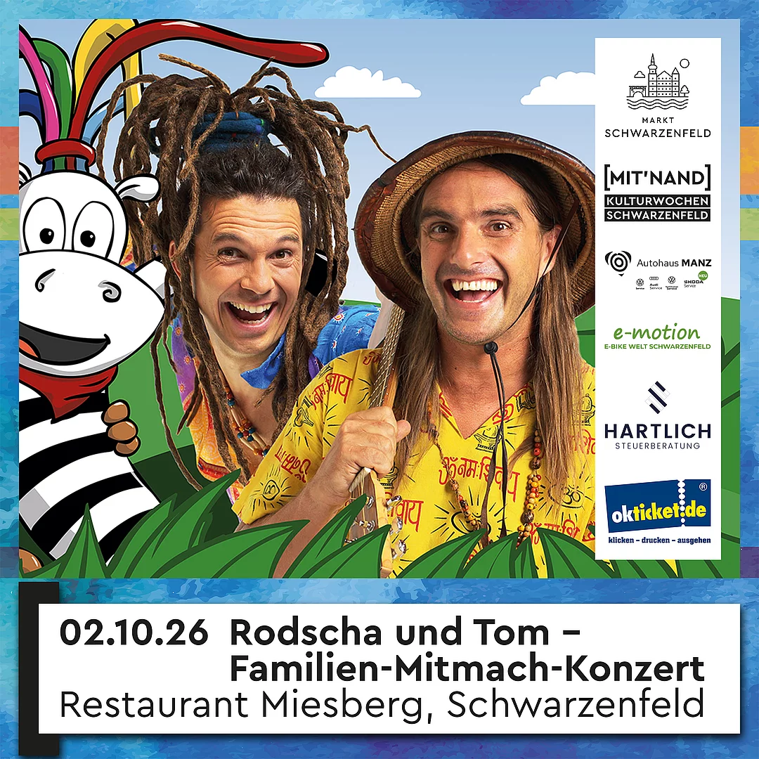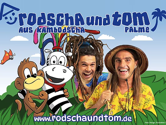 Rodscha und Tom sind Gewinner des Deutschen Kinderliederpreises. Sie begeistern nicht nur Kinder, sondern auch Eltern. Sei dabei, wenn sie live auf der Bühne in Schwarzenfeld auftreten! Begleitet von liebenswerten und vor allem lebensgroßen Figuren wie dem Rastazebra, dem kleinen Affen und dem Koala, erlebst du ein kunterbuntes Abenteuer im Konzert-Dschungel. Singe und feiere gemeinsam mit Rodscha und Tom und lass dich von ihren Werten wie Freundschaft, Mut, Glück und Dankbarkeit berühren. Erlebe das erste Konzert deines Kindes bei "Rodscha und Tom" und feiert zusammen dieses unvergessliche Live-Musik-Erlebnis! Ideal für Kinder ab 1.5 Jahren bis 8 Jahren.