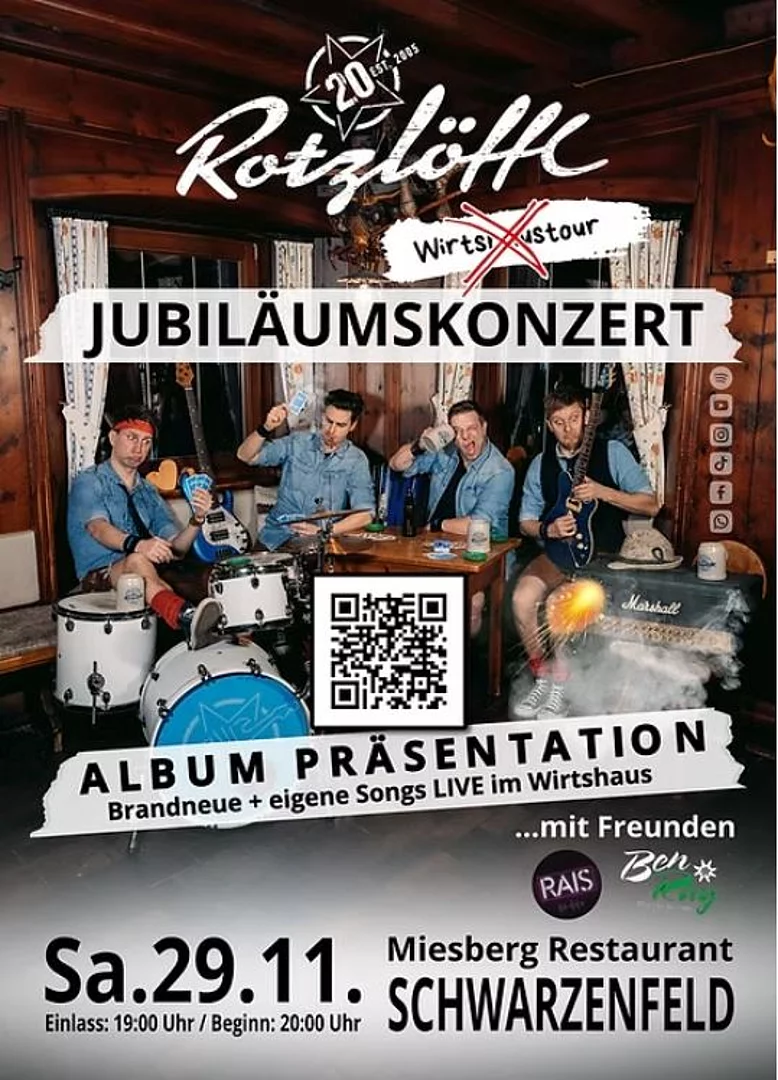 Das Finale der Wirtshaustour bildet das große Jubiläumskonzert am 29.11. in Schwarzenfeld. Dort zeigen die ROTZLÖFFL, was sie ausmacht: Leidenschaft, Spielfreude und der Fokus auf eigene Songs.