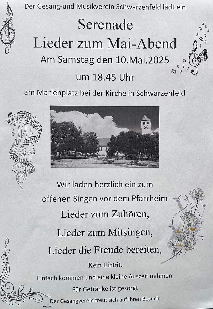 am Samstag den 10.Mai 2025 um 18.45 Uhr am Marienplatz bei der Kirche in Schwarzenfeld.