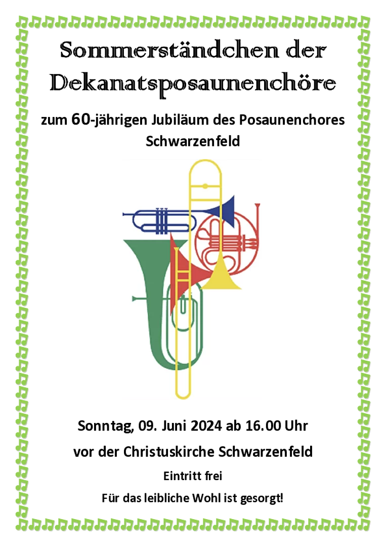 Ein vorgezogenes Geburtstagsgeschenk für den Evangelischen Posaunenchor, der dieses Jahr 60-jähriges Jubiläum feiert, ist das Sommerständchen am Sonntag, 9. Juni 2024 um 16:00 Uhr rund um die Christuskirche. Gestaltet wird dieses Ständchen von den vereinigten Posaunenchören des Dekanats Sulzbach-Rosenberg.