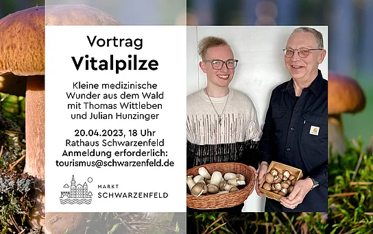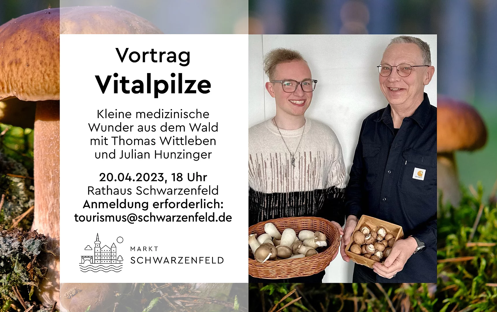 Entdecke die Vielfalt der Pilze: Genuss und Heilkraft vereint! Julian Hunzinger und Thomas Wittleben führen am 19.04.2024 in Schwarzenfeld durch eine faszinierende Reise in die Welt der Pilze. Dabei berichtet Julian Hunzinger über die Lebensweise von Pilzen, zeigt die interessantesten Funde aus den letzten Pilzexkursionen und erzählt über deren Bestimmung, Verwechslung und Anwendung in der Medizin! Thomas Wittleben berichtet anschließend über das medizinische Potenzial von Pilzen und zeigt medizinische Verwendungen der Pilze auf, zum Beispiel zur Leistungssteigerung, zur Vorbeugung von Krankheiten und zur Stärkung des allgemeinen Wohlbefindens. Freuen Sie sich auf einen interessanten Vortrag über die Welt der Pilze!