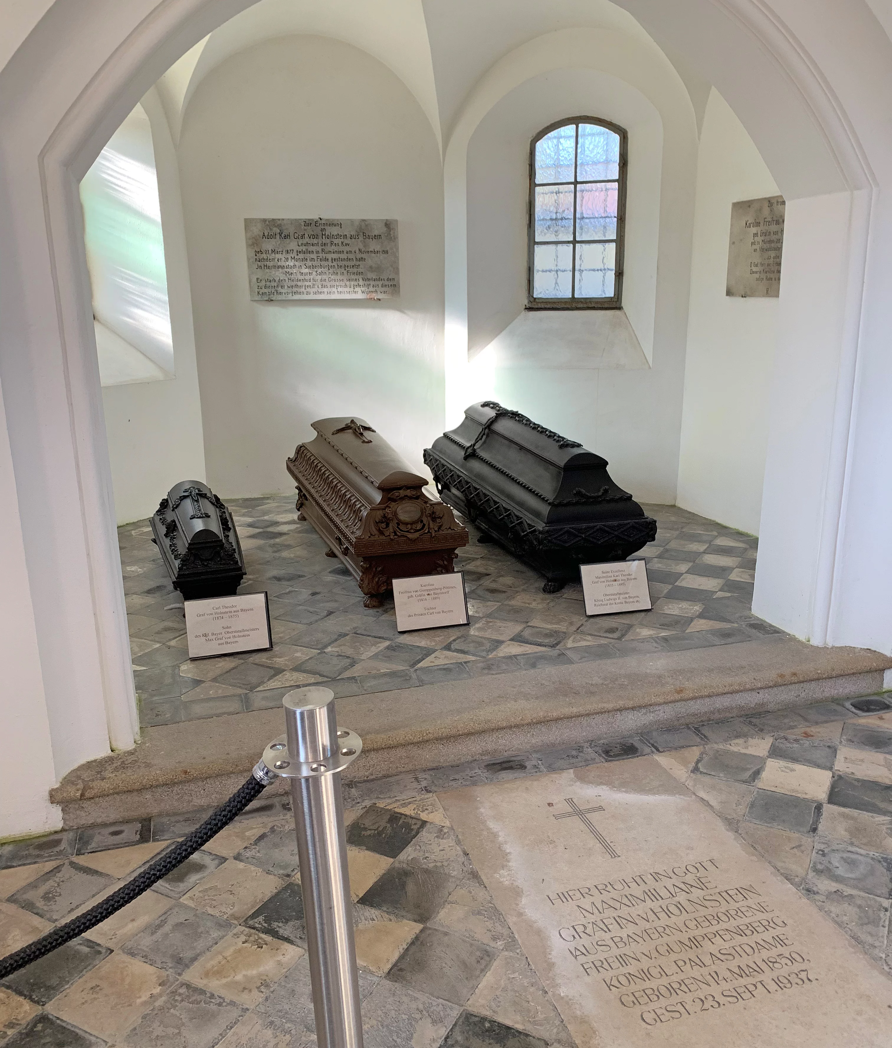 In einem Erdgrab in der Gruft ruht die Ehefrau des Oberststallmeisters König Ludwig II. von Bayern, Maximiliane Gräfin von Holnstein aus Bayern, geb. Freiin von Gumppenberg-Pöttmes (1850 – 1937).