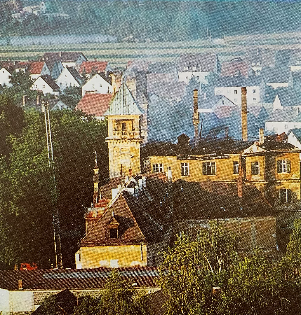 In den 70er Jahren wechselten mehrfach die Besitzer, bis am 25. Juni 1982 durch einen Großbrand das Ende für das Schloss gekommen schien. Kurz nach 1 Uhr nachts wurden die Schwarzenfelder durch laut dröhnendes Sirenengeheul aus dem Schlaf gerissen. Fassungslos wurden die Menschen Zeugen, wie das Wahrzeichen des Marktes in Flammen stand. Insgesamt 122 Männer von acht Feuerwehren gaben ihr Bestes, doch als die verkohlten Balken des Schloßturms nachgaben und das Bauwerk im Hof zerschellte, schien darunter auch die ganze Geschichte des einst so stolzen Grafenschlosses begraben zu werden. Das Schloss war zur Ruine geworden. Ein erster Versuch eines Wiederaufbaus durch ein privates Unternehmen scheiterte Mitte der 80er Jahre.