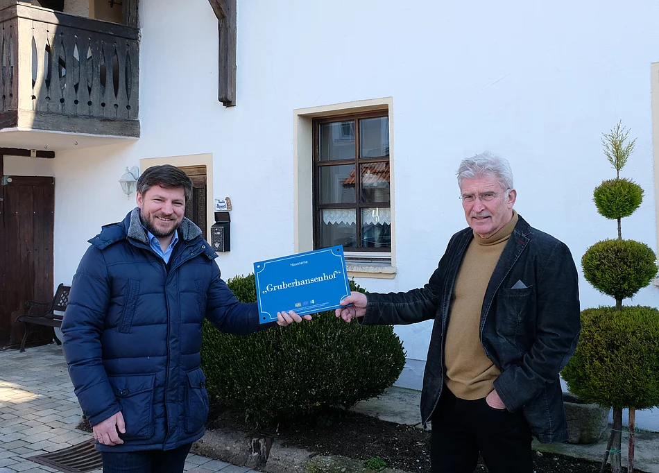 In den letzten Jahrzehnten in den Hintergrund gerückt, stoßen Hausnamen gerade bei jungen Bewohnern in ländlichen Gebieten wieder auf Interesse mit Fragen zur Herkunft. In Zusammenarbeit mit Heimatpflegern, Arbeitskreisen und Kulturvereinen hat der Verein Regionalentwicklung des Landkreises Schwandorf e.V. in einem Projekt die Hausnamen neu aufgelegt. Bürger konnten ihre Hausnamen einreichen und hochwertig produzierte Hausnamen-Schilder erhalten, die über die Gemeindeverwaltungen verteilt wurden. Bürgermeister Peter Neumeier überreichte vor Kurzem eines dieser neuen Schilder an Manfred Röhl in der Kirchstraße. Das alte "Bartmann-Wirtshaus", wie es ältere Schwarzenfelder noch kennen, trägt den Hausnamen "Gruberhansenhof", abgeleitet vom "Grouerhof" mit früherem Standort (Grouer oder auch Grubach, beim Hochspeicher Richtung Schmidgaden).