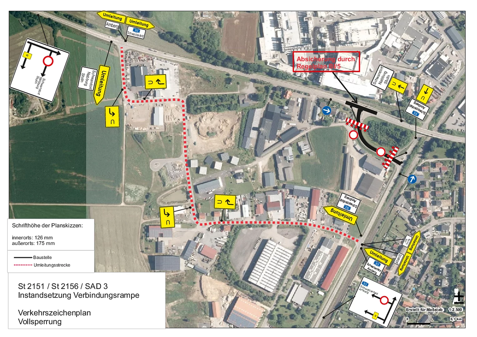 Das Staatliche Bauamt Amberg-Sulzbach informiert, dass an der Verbindungsrampe zwischen der St2151 und der St2156 (Verbindung zw. der Amberger Straße und der Böttgerstraße) Schadstellen saniert werden müssen. In diesem Zuge muss die Verbindungsrampe vom 31.05.2023 bis 03.06.2023 für den Verkehr gesperrt werden. Die Umleitungsstrecke führt durch das Industriegebiet über die Ohmstraße und die Max-Planck-Straße. Einzelheiten sind der Skizze unter Downloads zu entnehmen. Die Verwaltung bittet die Verkehrsteilnehmer und Gewerbetreibenden entlang der Umleitungsstrecke um Verständnis.