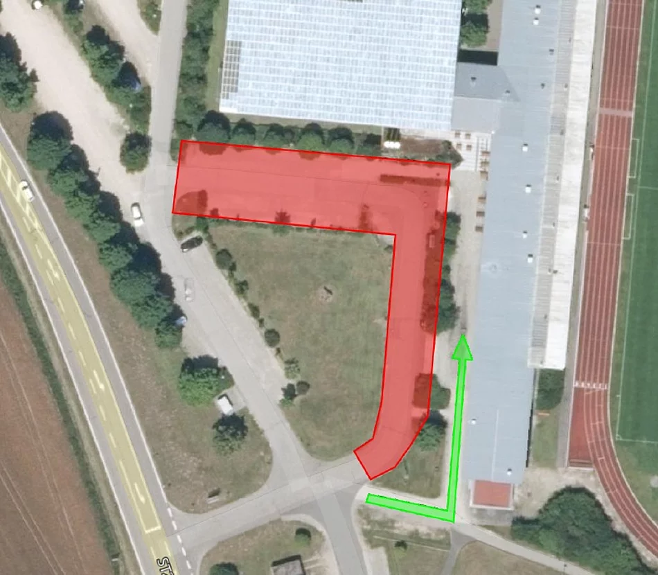 Im Zuge von Arbeiten am Dach der Sportparkhalle muss zur Sicherung der Arbeitsstelle der in der Skizze rot markierte Bereich vor der Sportparkhalle ab heute, 18.03. bis voraussichtlich 25.03. gesperrt werden! Der Zugang zur Halle für Fußgänger erfolgt über den erhöhten Weg am Gebäude entlang – grüner Pfeil in der Skizze.