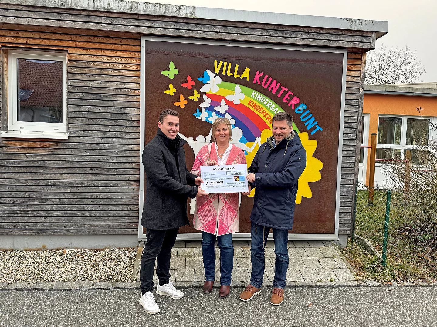Die ortsansässige Steuerkanzlei Hartlich entschied sich, in diesem Jahr nicht wie sonst postalische Weihnachtsgrüße an Kunden und Klienten zu schicken, sondern das dafür vorgesehene Budget in Höhe von 1.000 Euro zu spenden. „Die Mitarbeiterinnen des Kindergartens leisten hervorragende Arbeit. Es freut uns, dass wir hier den Kindern eine Freude machen und dem Personal gleichzeitig unsere Anerkennung aussprechen können“, so Geschäftsführer Fabian Hartlich bei der symbolischen Scheckübergabe. Seitens der Villa Kunterbunt und dem Markt Schwarzenfeld als Träger bedankten sich Kindergartenleiterin Sabine Nickert und Bürgermeister Peter Neumeier für das vorgezogene Weihnachtsgeschenk. Mit der Spende werden pädagogische Projekte unterstützt und das ein oder andere Spielzeug neu angeschafft werden können.