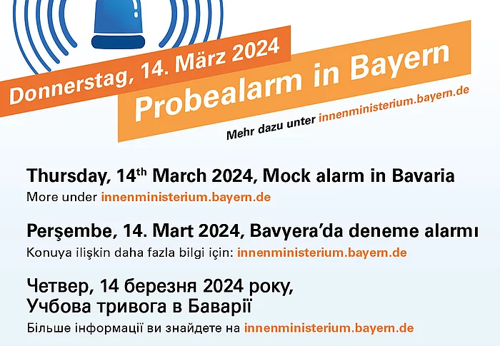 Am 14. März 2024 findet in Bayern der landesweit einheitliche Probealarm statt. Neben den vorhandenen Sirenen der Gemeinden und Kreisverwaltungsbehörden werden auch andere Warnmittel, z. B. Warn-Apps und Cell Broadcast, erprobt.